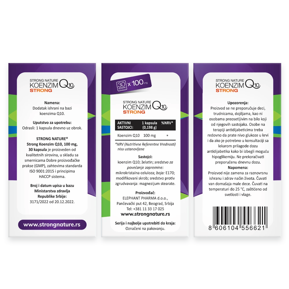 Strong Nature® Strong Koenzim Q10 100 mg je dijetetski proizvod, izrađen u visokom nivou kvaliteta, koji sadrži optimalne koncentracije koenzima Q10 u jednoj dozi, dolazi u formi kapsula  što omogućava jednostavniju i lakšu upotrebu.